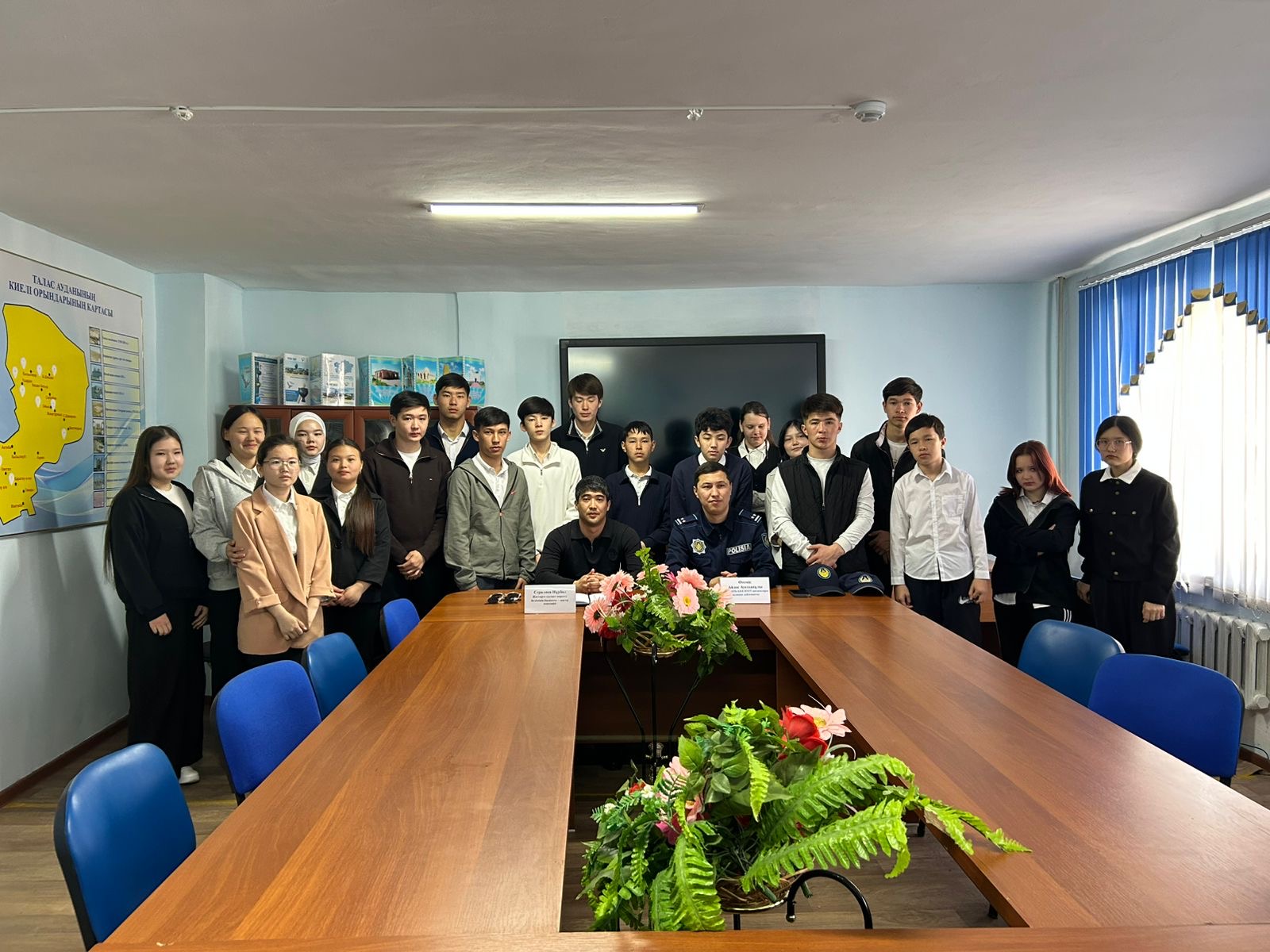 Кездесуге Талас аудандық полиция бөлімінің ювеналды полиция тобының инспекторы, полиция лейтенанты Өтеміс Айдос Әуесханұлы қатысып, жастар арасында құқықбұзушылықтың алдын алу мәселелерін кеңінен қозғады. Ол құмар ойындардың адам өміріне тигізетін кері әсерін нақты мысалдармен түсіндіріп, мұндай әдеттің әлеуметтік және қаржылық қиындықтарға әкелетінін атап өтті. Сонымен қатар заң аясындағы жауапкершілікке де тоқталды.